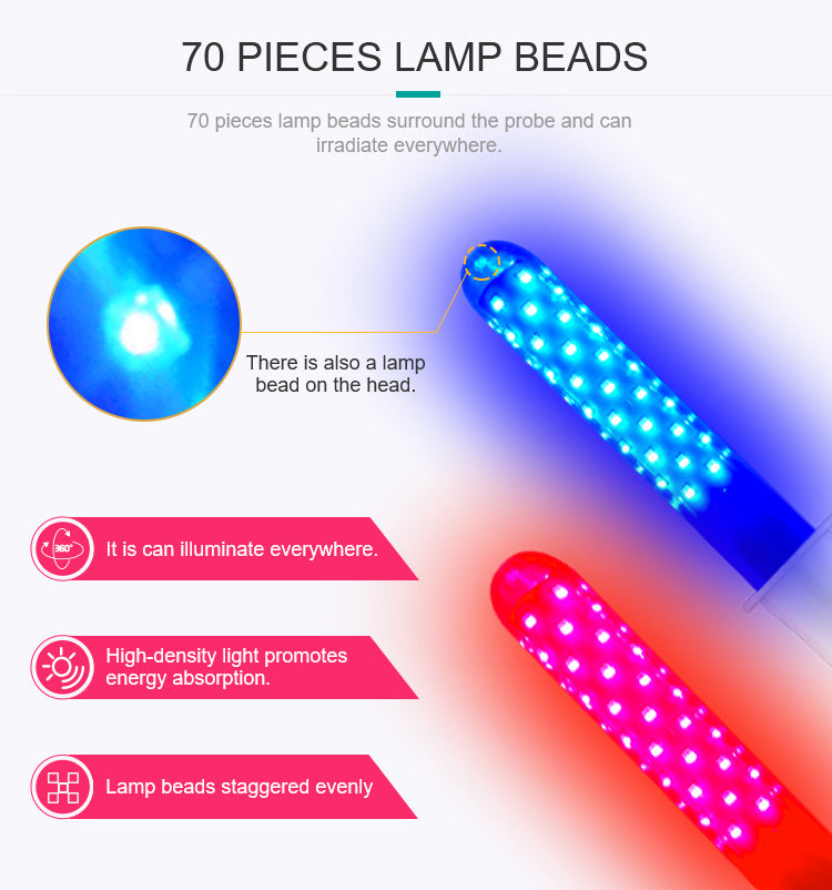630nm light irradiation can penetrate elastic fiber of viginal wall, improve vagina blood flow, supply oxygen and nutrient to vaginal, repair dagamed elastic fiber tissue. 465nm Blue Light forms a single petide oxygen tight sterilized vaginal bacteria kill bacteria.Detox and eliminate odors and pruritus.